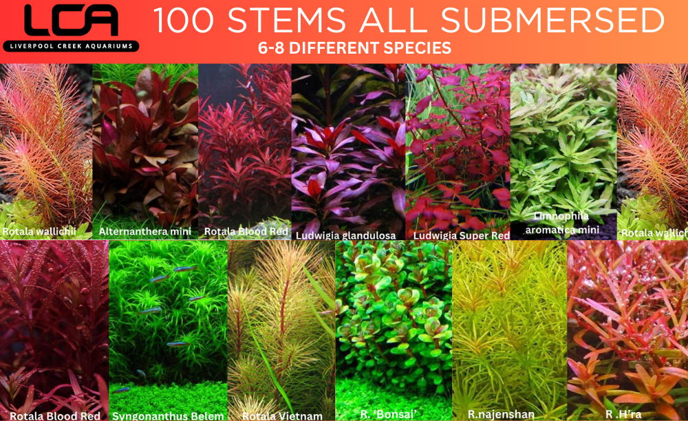 This beautiful variety of submersed plants is perfect for any hobbyist looking to fill out their aquascape with vibrant colours and contrasting foliage. 100 stems selected from 6-8 different species will give you plenty to work with.